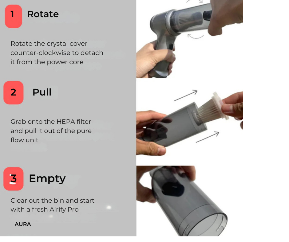 Cleaning your Airify filter takes just seconds — simply rotate the cover, pull out the HEPA filter, and empty the bin for like-new performance every time.